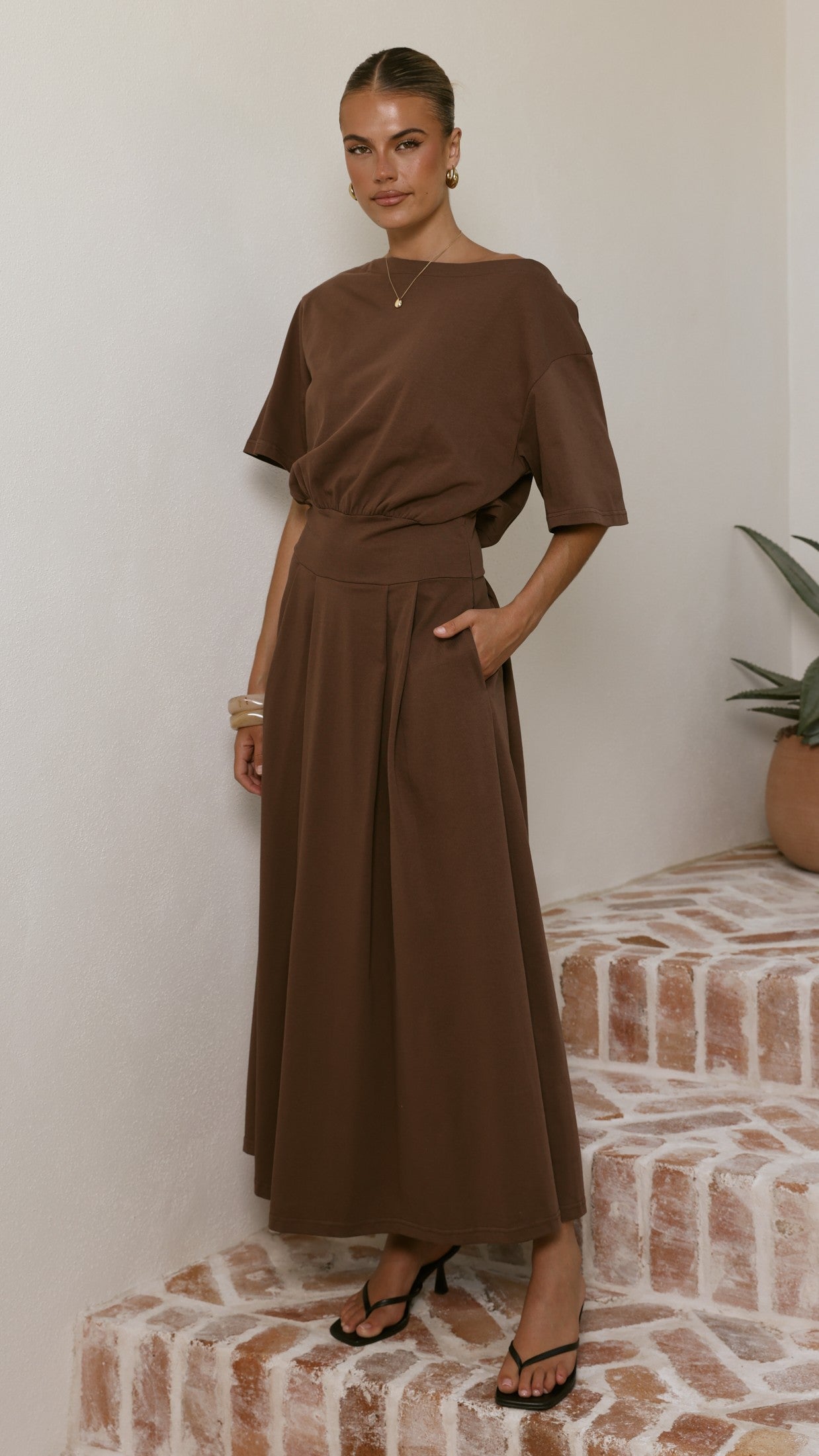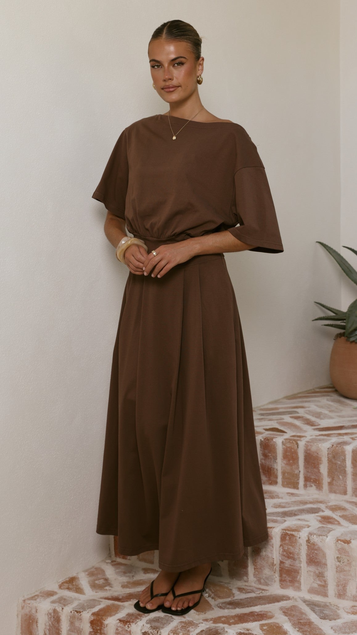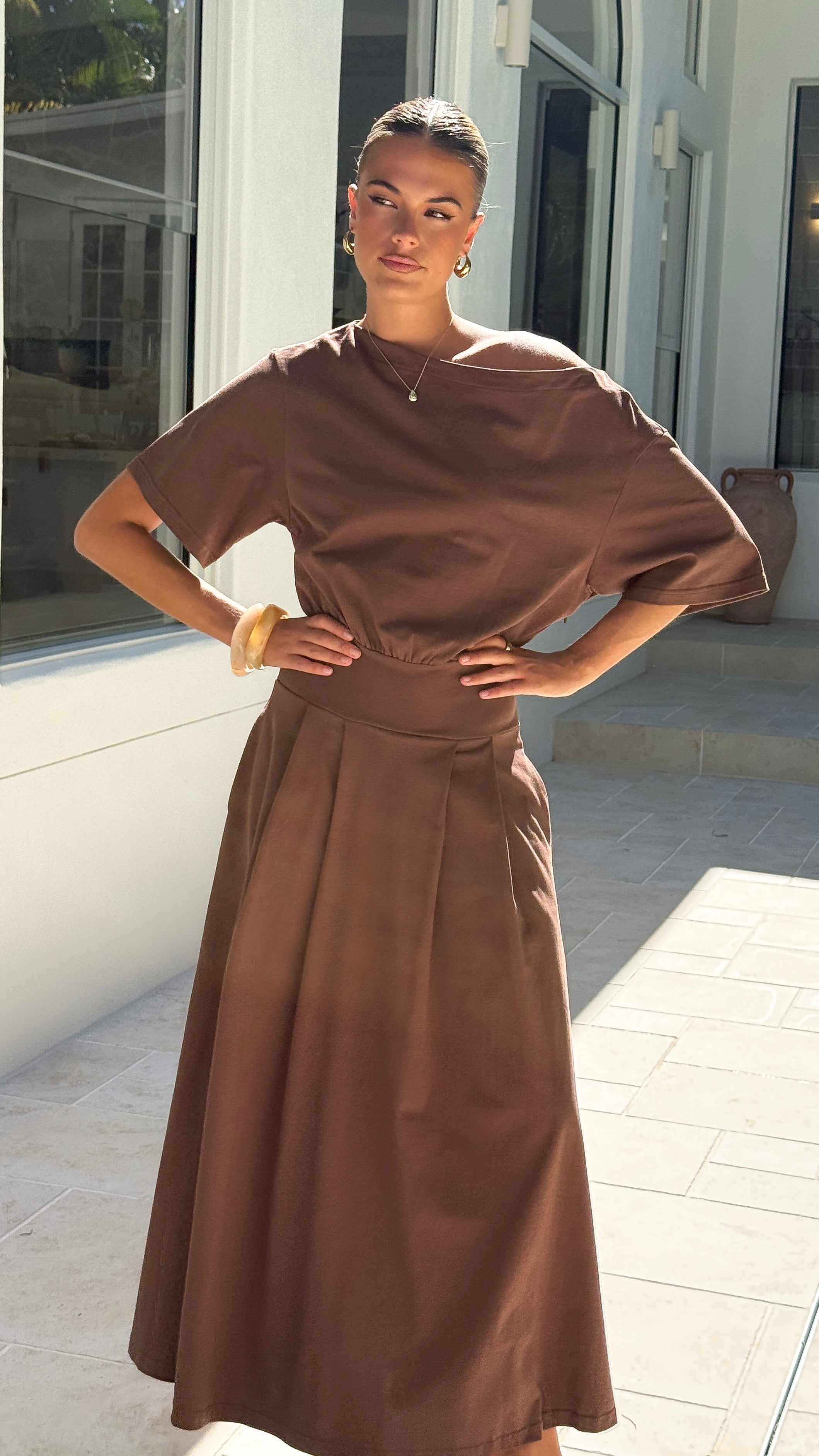The Aleski Maxi Dress delivers contemporary elegance with its off-shoulder neckline and short sleeves. A structured thick waistband anchors the design, while the pleated skirt provides graceful volume and movement. An invisible side zipper ensures a seamless silhouette, making this maxi dress both polished and effortlessly wearable for any occasion.
