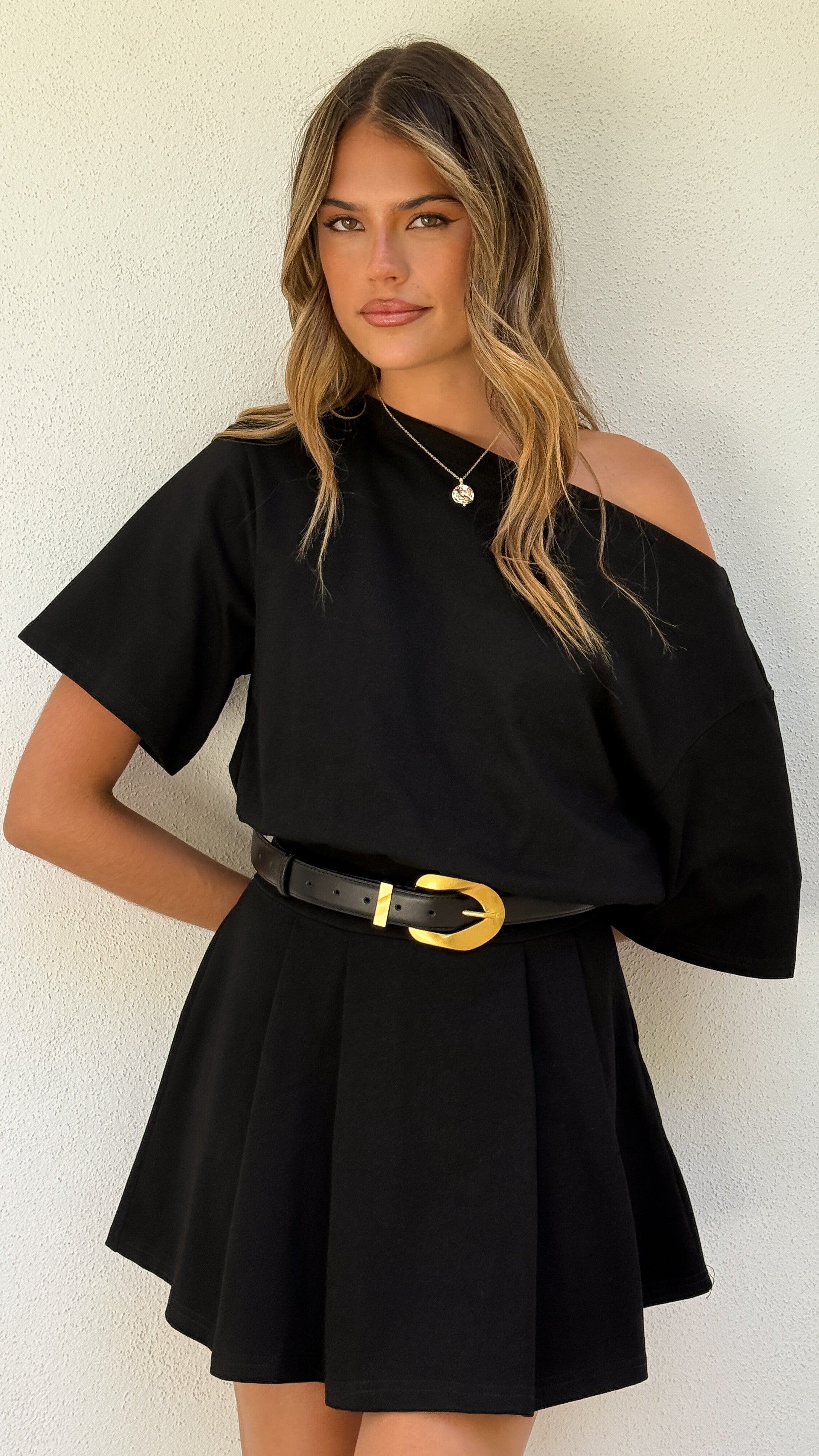 The Aleski Mini Dress delivers contemporary elegance with its off-shoulder neckline and short sleeves. A structured thick waistband anchors the design, while the pleated skirt provides graceful volume and movement. An invisible side zipper ensures a seamless silhouette, making this mini dress both polished and effortlessly wearable for any occasion.