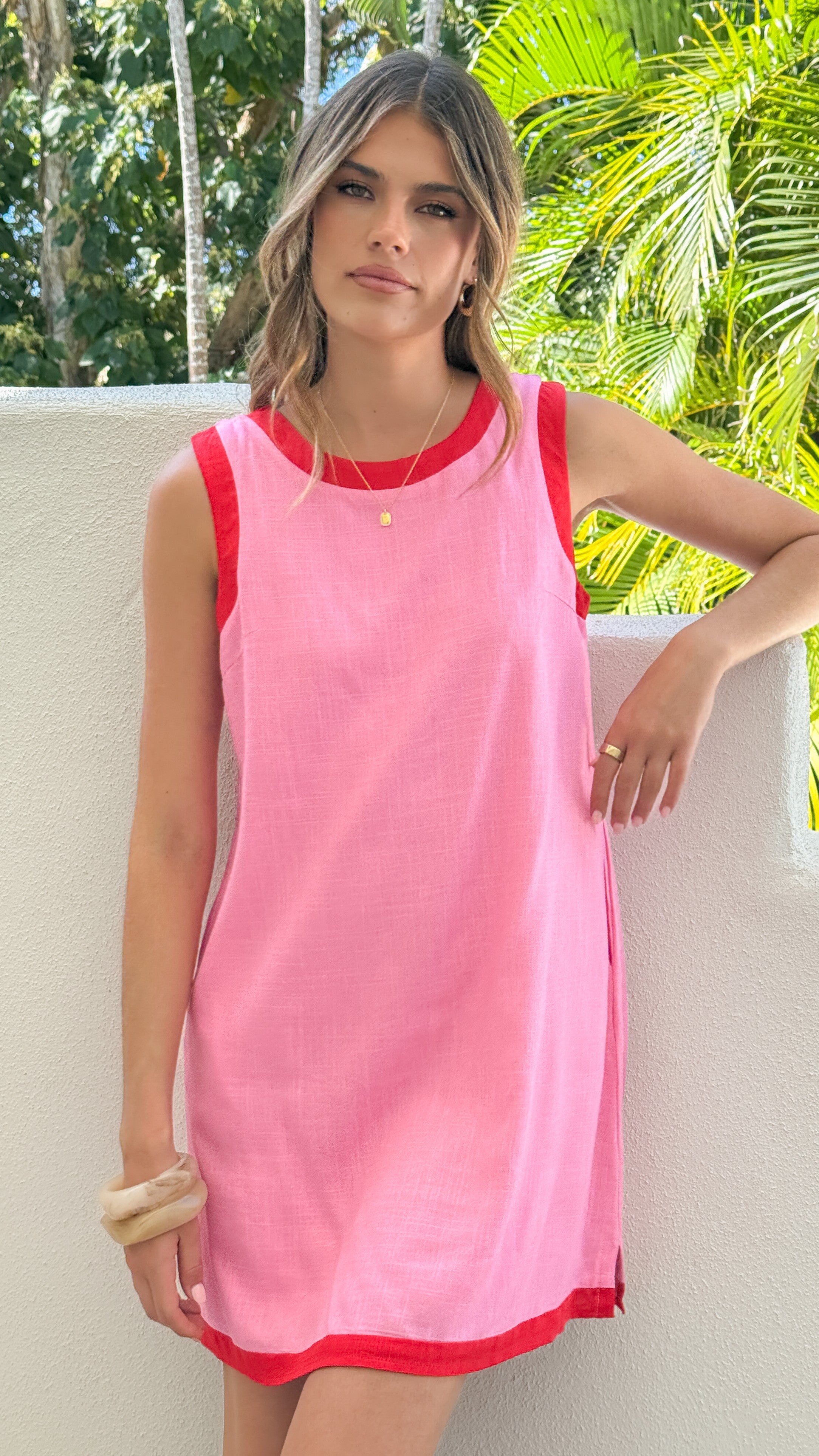 The Amara Mini Dress in Pink/Red offers effortless sophistication with practical style. This sleeveless design features a classic crew neckline and relaxed fit that moves with you throughout the day. Contrast binding details frame the silhouette, while mini side splits add subtle movement and visual interest. Hidden side pockets provide convenient functionality.