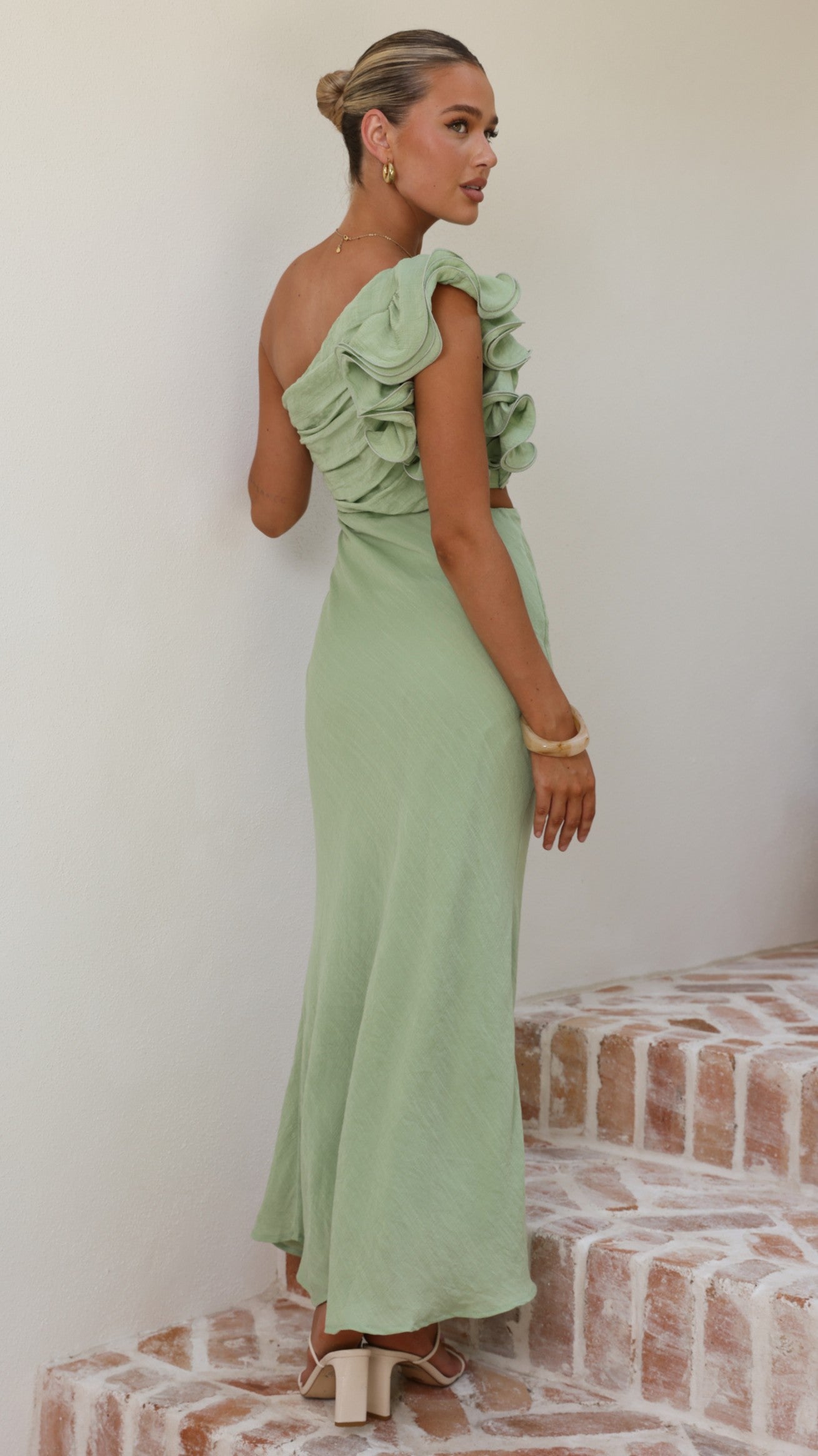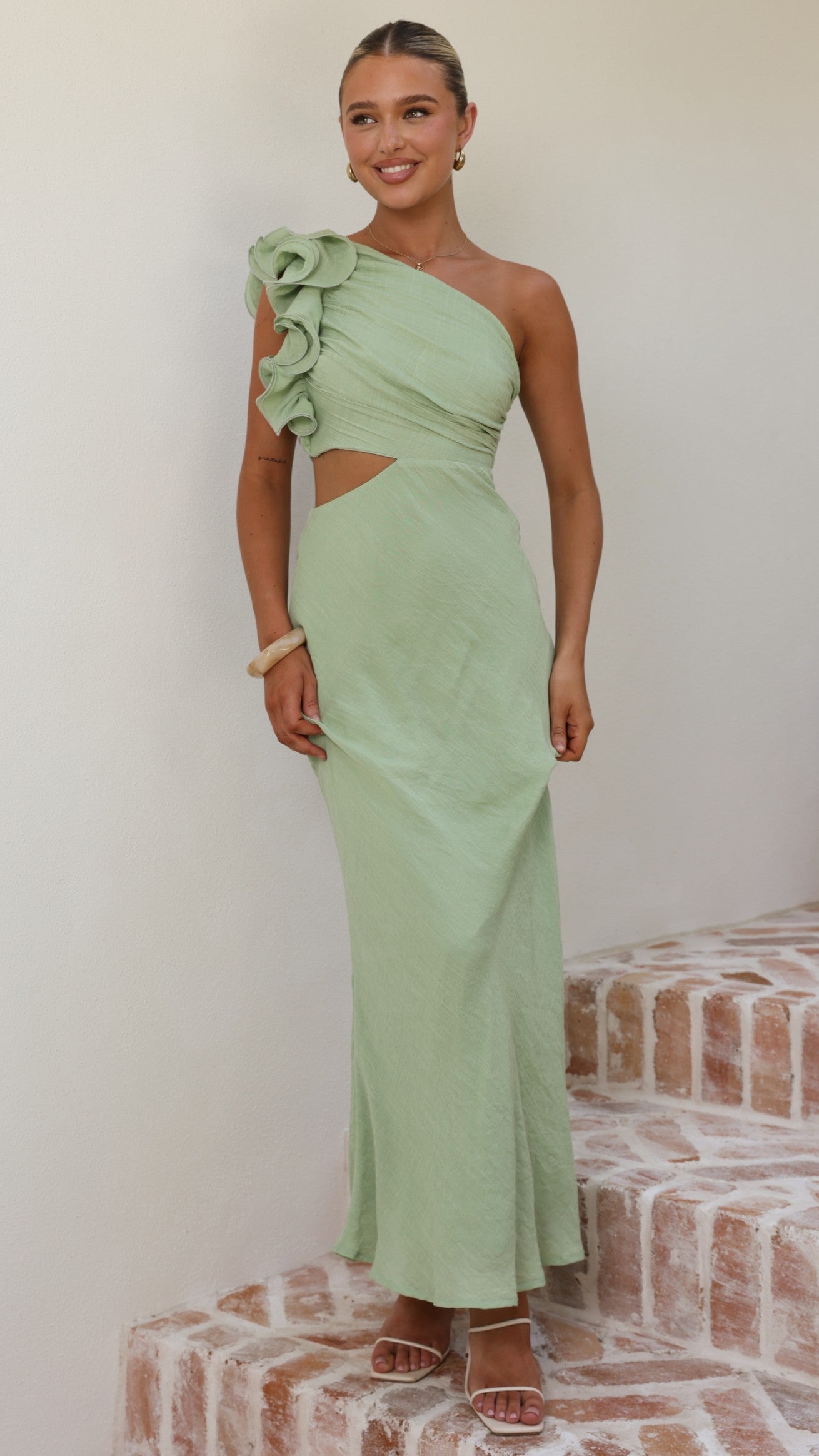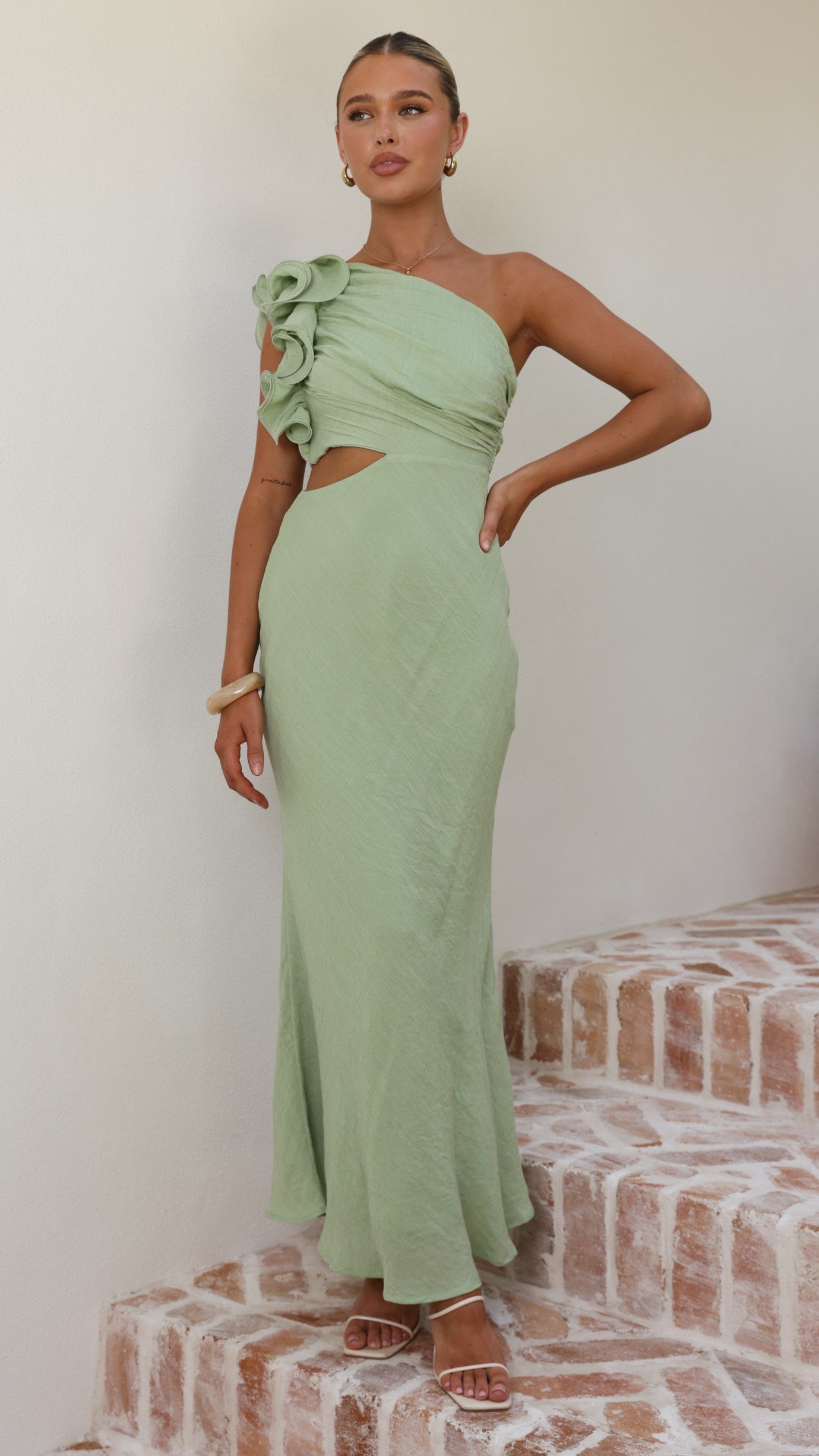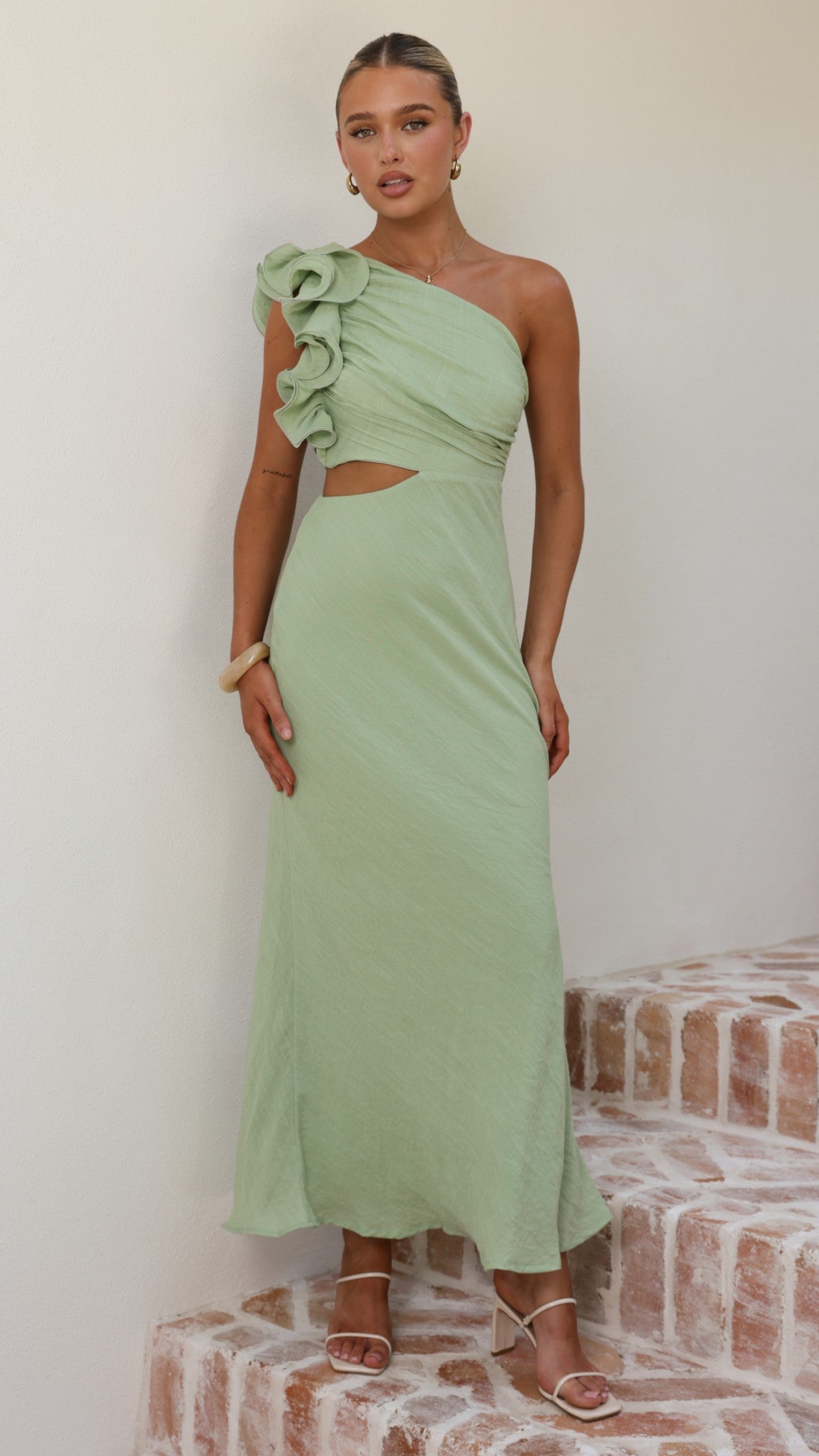 The Amina Maxi Dress in Sage is a striking statement piece with contemporary elegance. Its one-shoulder silhouette is enhanced by delicate frill detailing that adds movement and dimension. A strategic side cut-out creates visual intrigue, while the fully lined construction ensures comfort and confidence. An invisible side zip provides a polished finish.