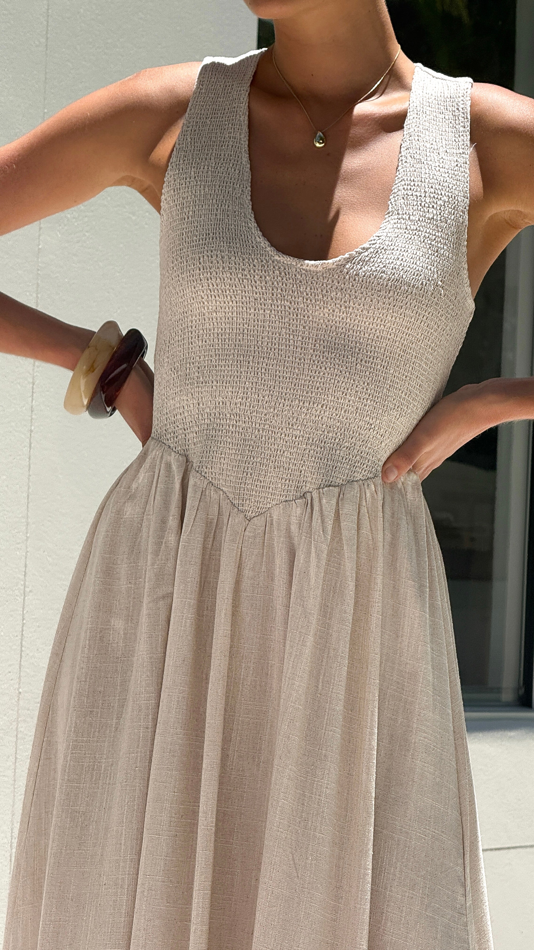 The Amira Maxi Dress combines elegance with contemporary design. This maxi-length piece features a refined scoop neckline and supportive racerback straps for comfort and style. The shirred bodice creates flattering definition through the torso, while a subtle side split adds movement and sophistication. Perfect for evening occasions or elevated everyday wear.