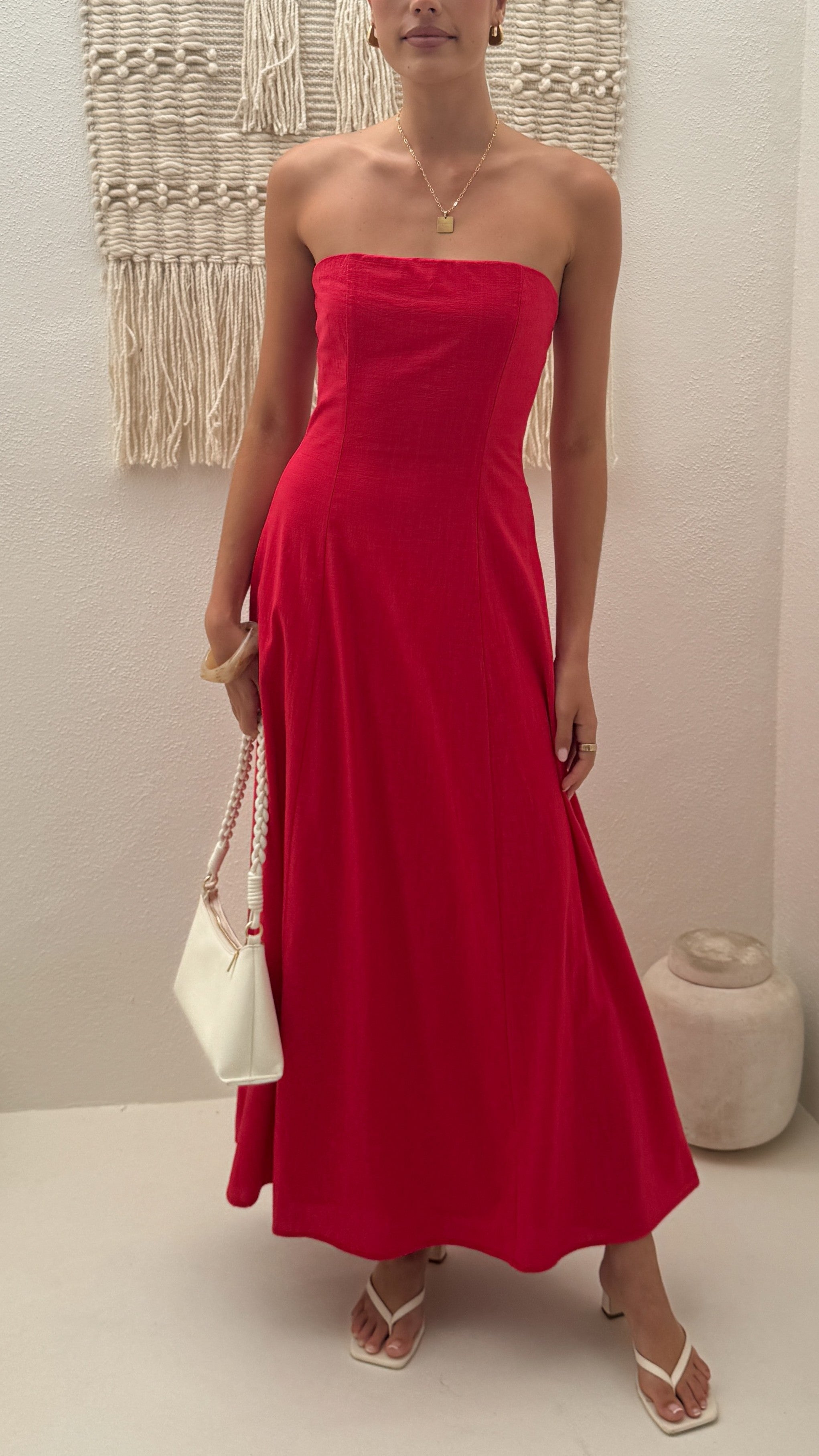 Elevate your elegance with the Astrid Strapless Maxi Dress in red. Featuring a sophisticated strapless design and linen-look fabric, this dress offers both comfort and style. The invisible centre back zipper ensures a seamless fit, while thoughtful panelling enhances the silhouette. Fully lined for a polished finish.