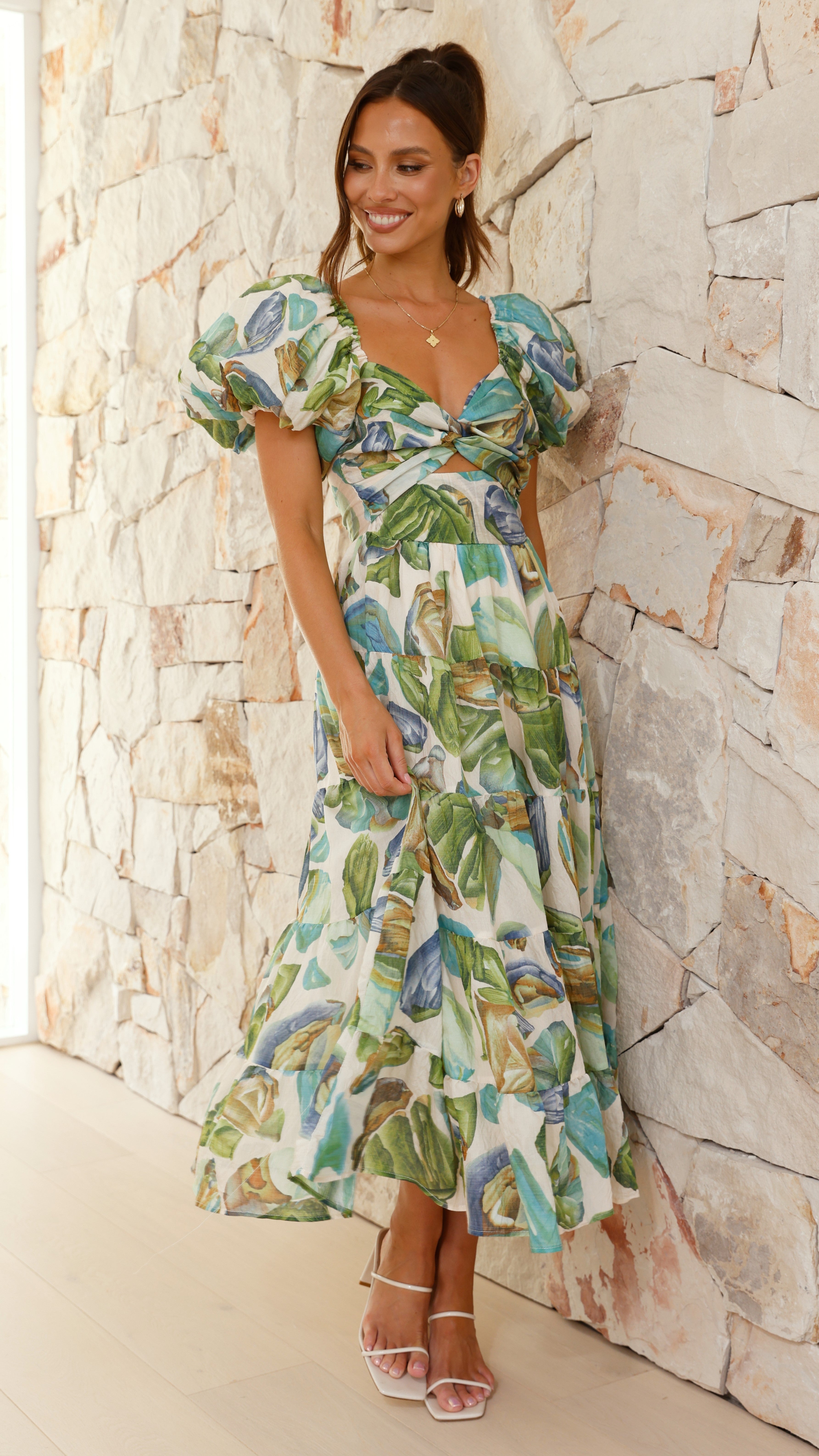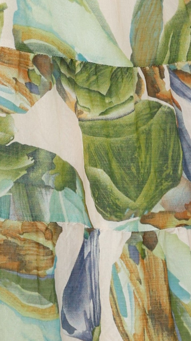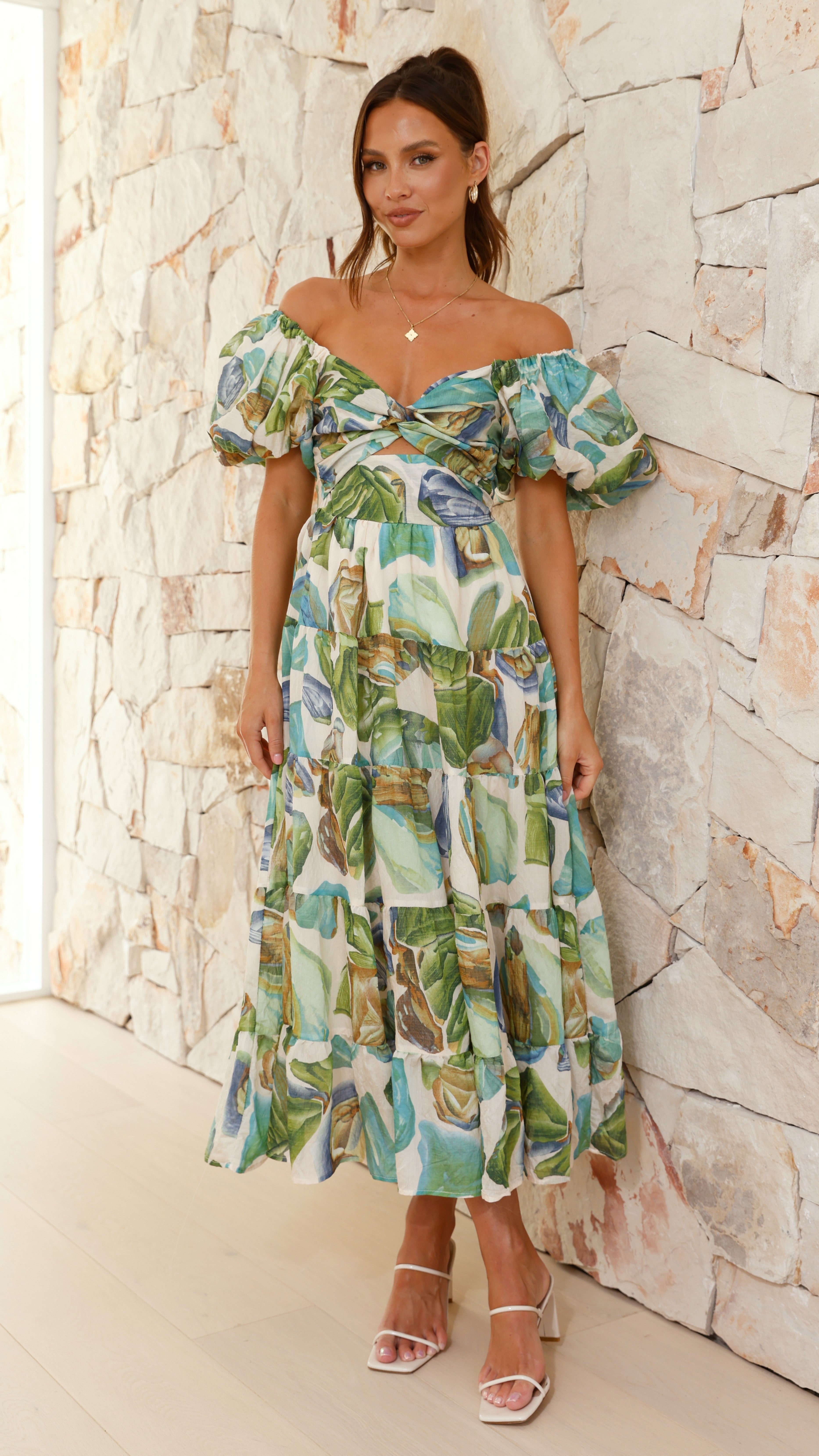 Elevate your style with the Balthazar Maxi Dress in a striking green and blue print. Featuring elasticated puff sleeves and a versatile twist front design, this dress can be worn on or off the shoulder for effortless elegance. The front cutout adds a subtle allure, while the invisible back zip with shirred panel ensures a comfortable fit. Its maxi length and tiered skirt detailing create a graceful silhouette perfect for any occasion. Embrace both comfort and sophistication in this standout piece.
