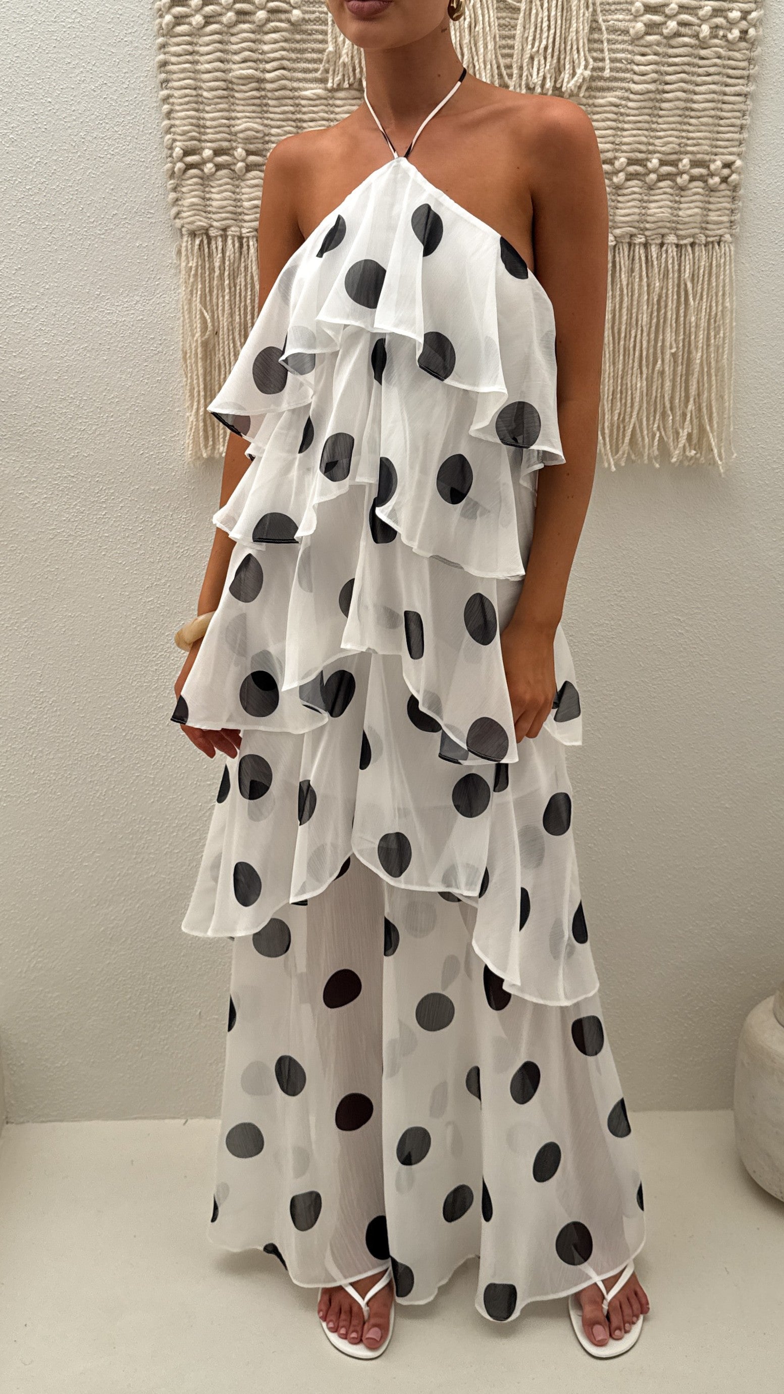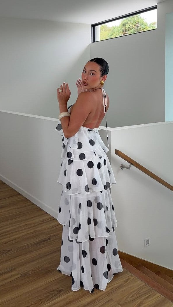 The Loana Maxi Dress combines timeless elegance with contemporary flair. This sophisticated piece features a flattering halter neckline and flowing maxi silhouette, accented with delicate frill detailing. The invisible centre back zipper ensures a seamless finish, while the mini dress length lining provides practical coverage underneath. Secured with a hook and eye closure for a polished look.