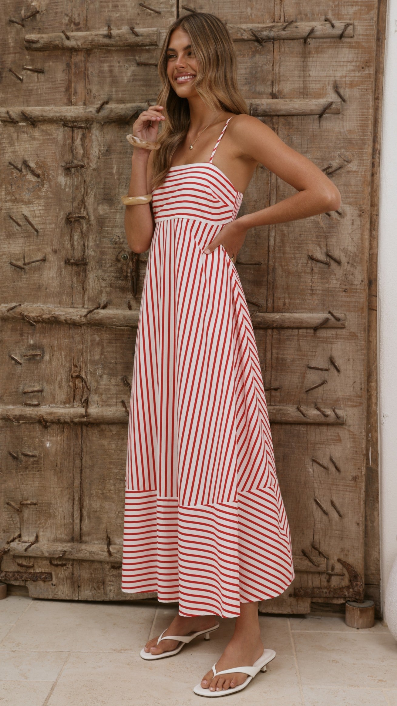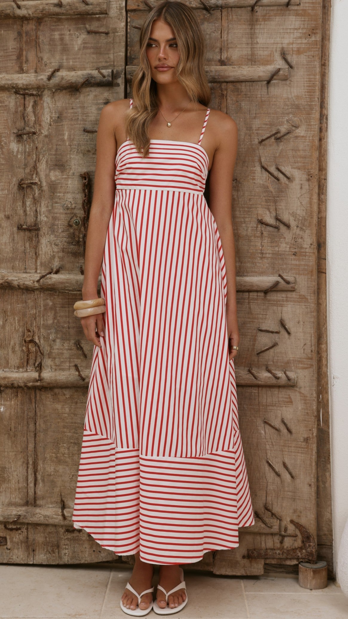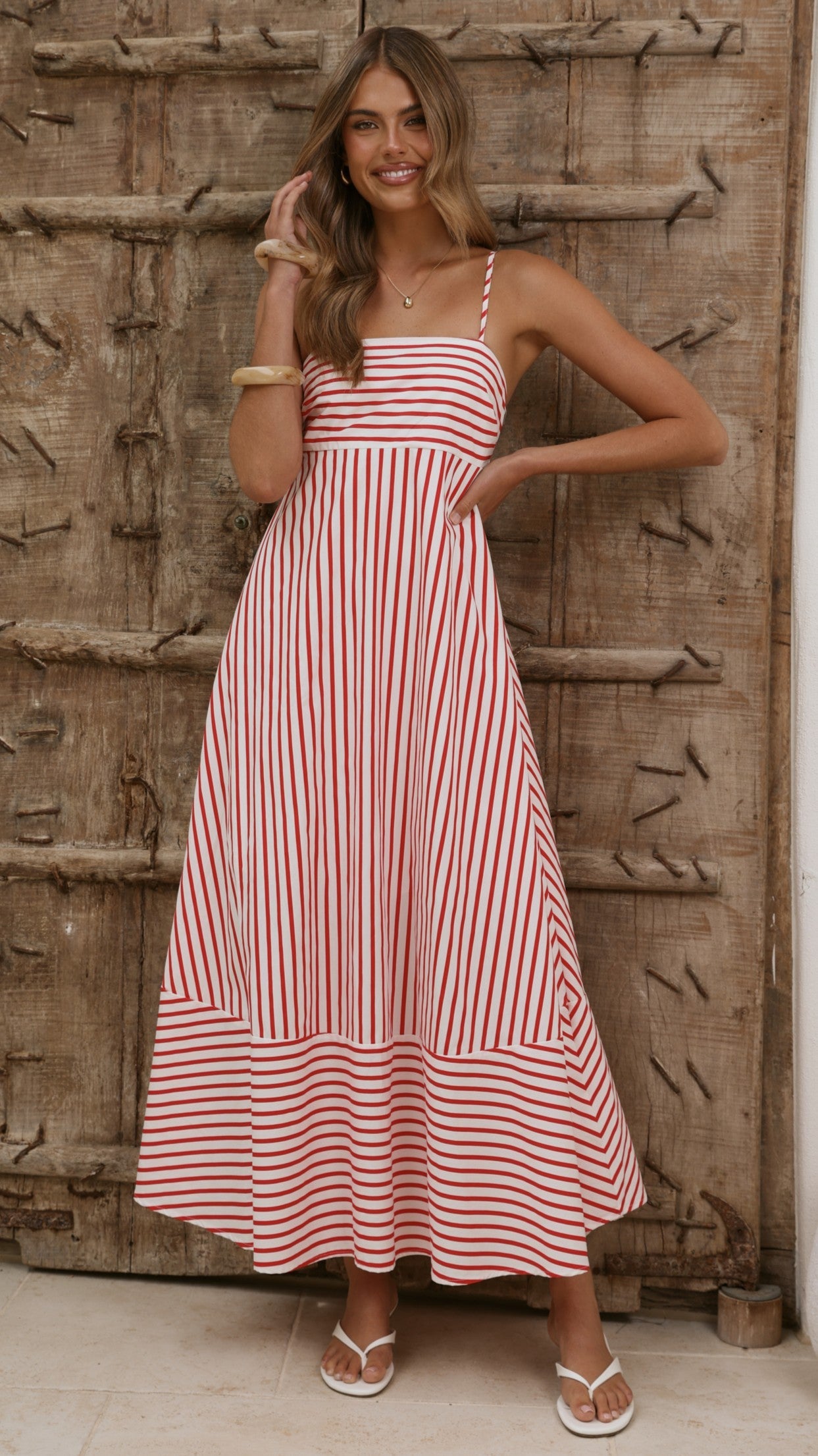 The Marcel Maxi Dress in vibrant red/white stripes features adjustable shoulder straps, a flattering square neckline, and elasticated back band for a secure fit. Hidden side zipper and full lining complete this elegant piece.