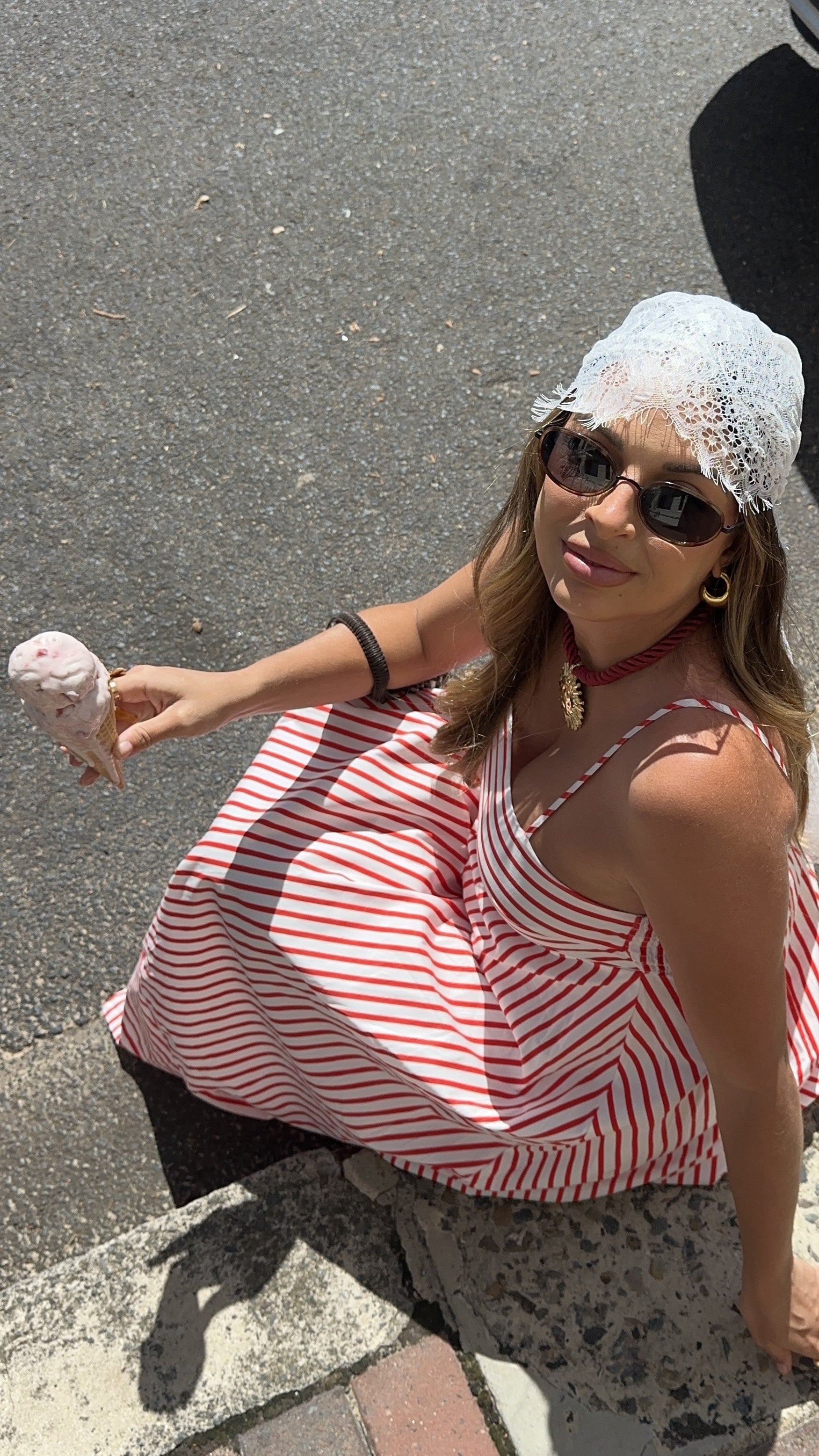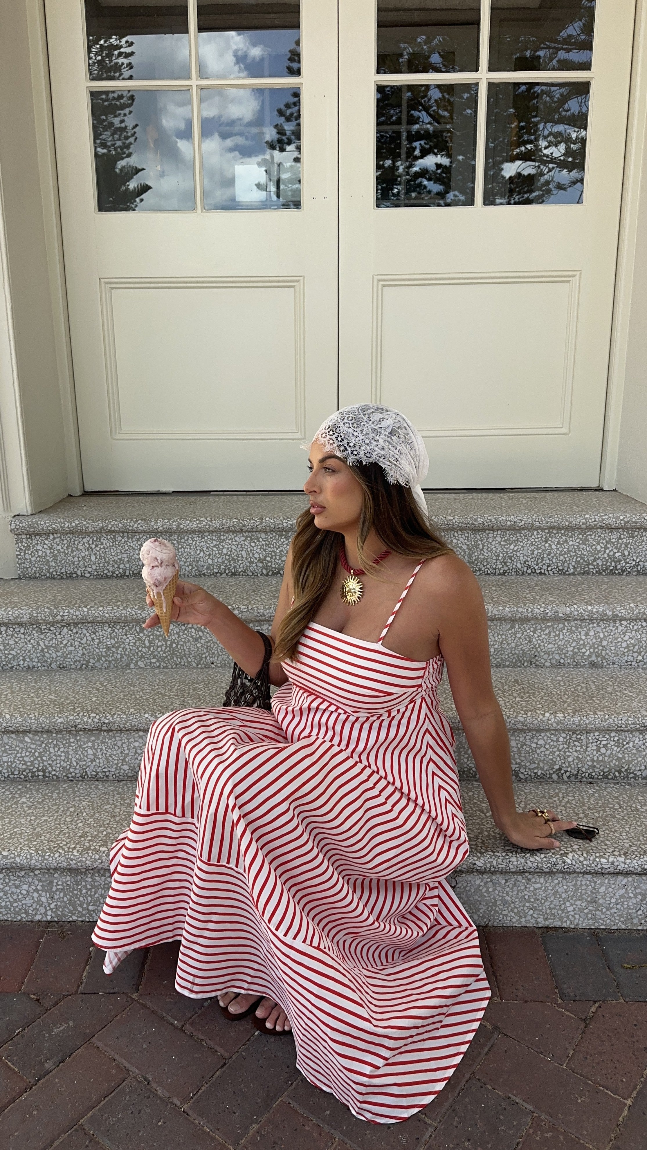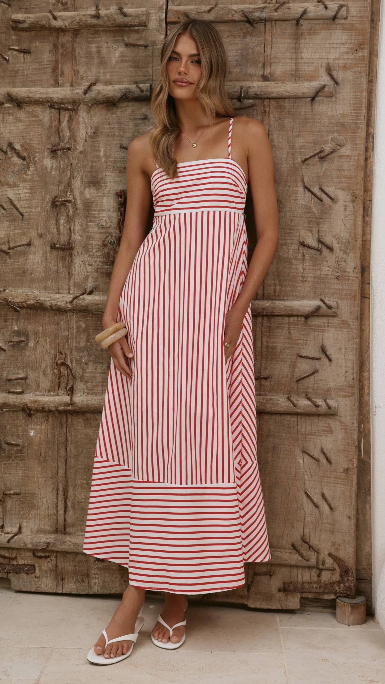 The Marcel Maxi Dress in vibrant red/white stripes features adjustable shoulder straps, a flattering square neckline, and elasticated back band for a secure fit. Hidden side zipper and full lining complete this elegant piece.