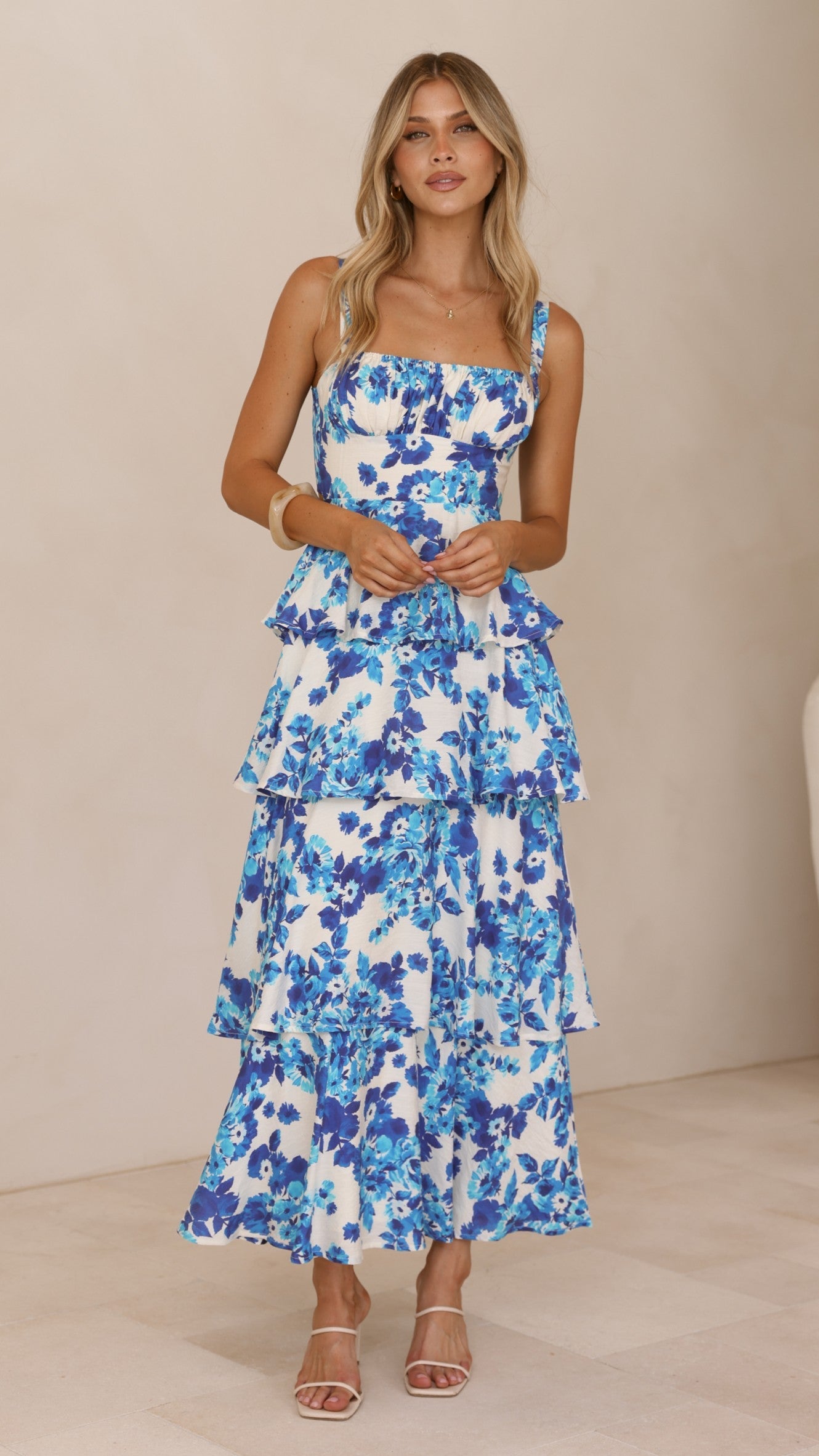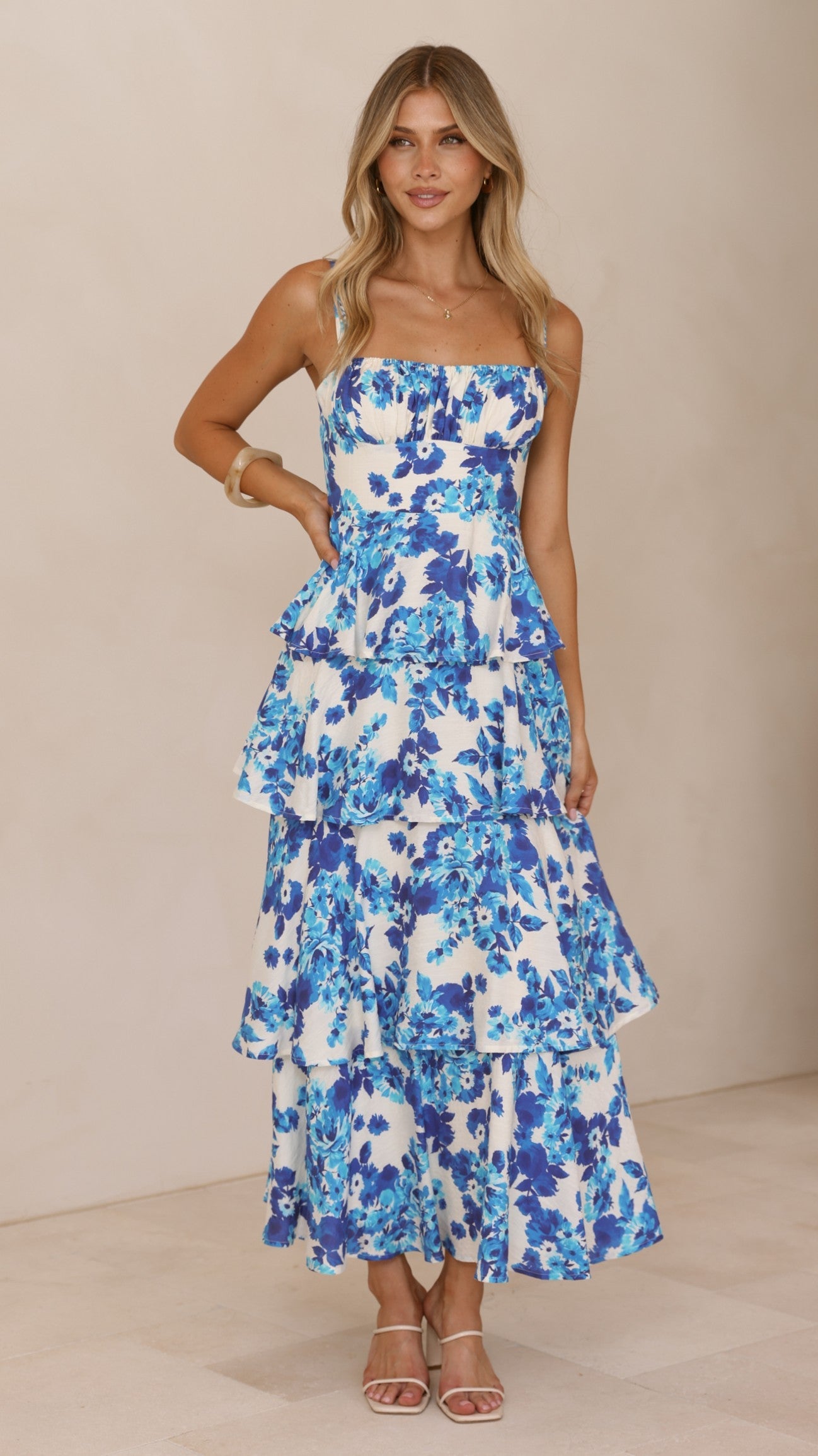 This elegant maxi dress showcases adjustable straps and a gathered bust for a flattering fit. The ruffled skirt adds a touch of femininity, while a tie-up bow at the back enhances its refined silhouette. Finished with an invisible back zip and full lining, it offers both style and comfort.
