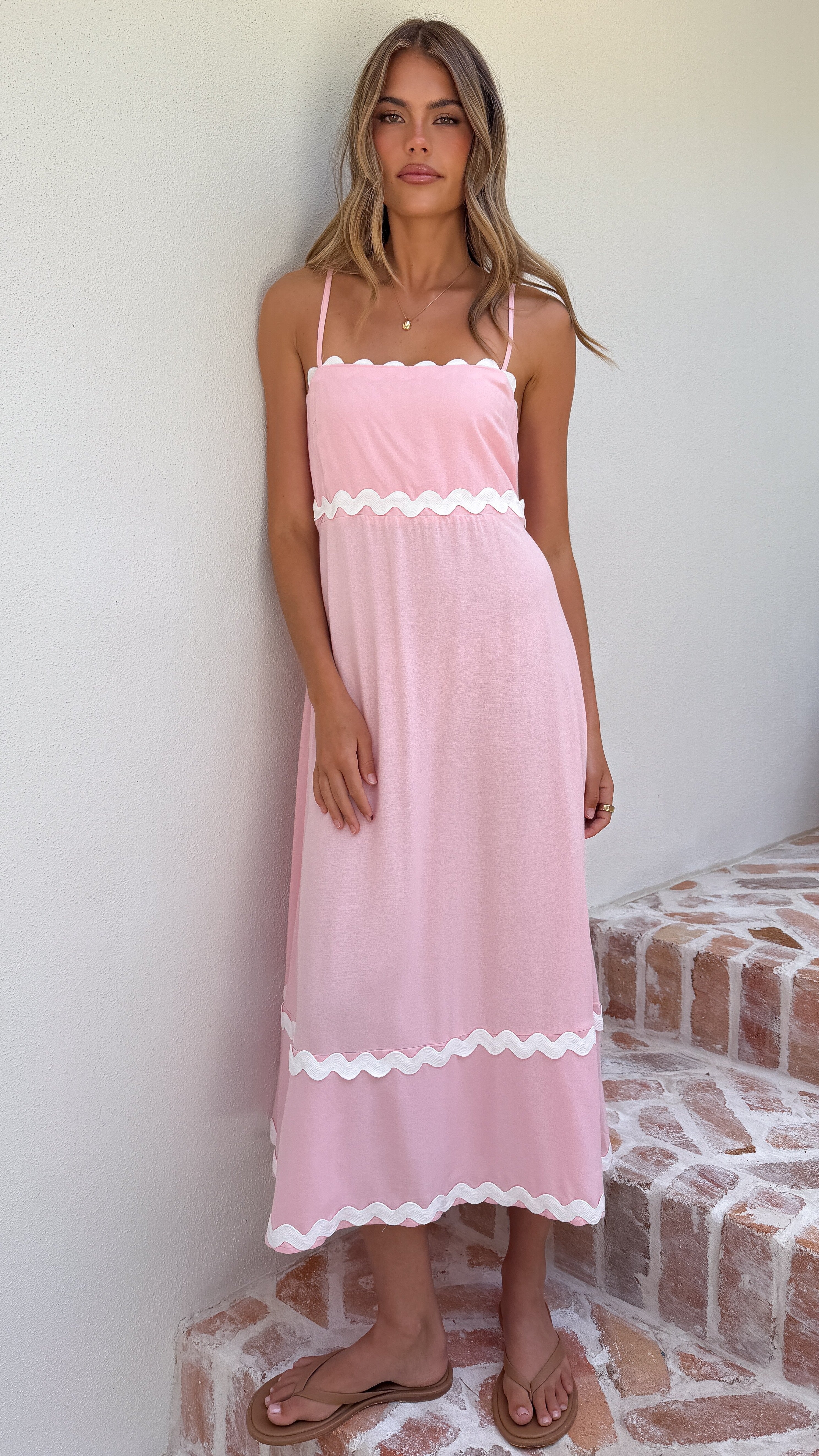The Seraphina Maxi Dress combines timeless elegance with thoughtful details. This maxi-length style features a flattering square neckline and adjustable spaghetti straps for a customisable fit. The shirred back panel creates subtle texture and movement, while charming ric rac trim adds a refined touch. Practical hidden side pockets keep essentials close, and the lined bust ensures comfort and confidence.