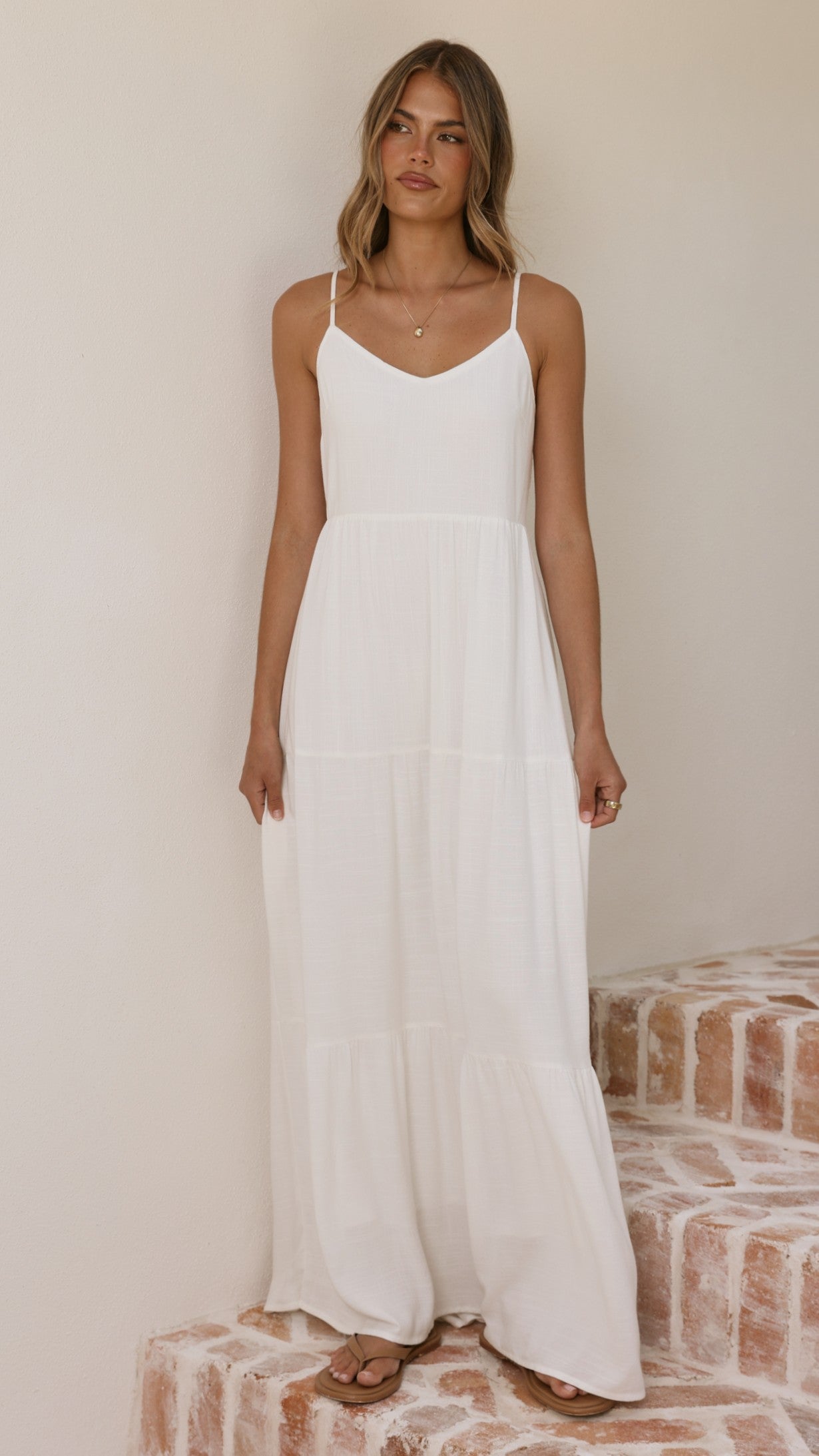 The Shelley Maxi Dress combines elegance with effortless style. This maxi-length dress features adjustable spaghetti straps for a customisable fit, a shirred back panel for subtle texture and movement, and a graceful tiered skirt design that creates beautiful dimension.