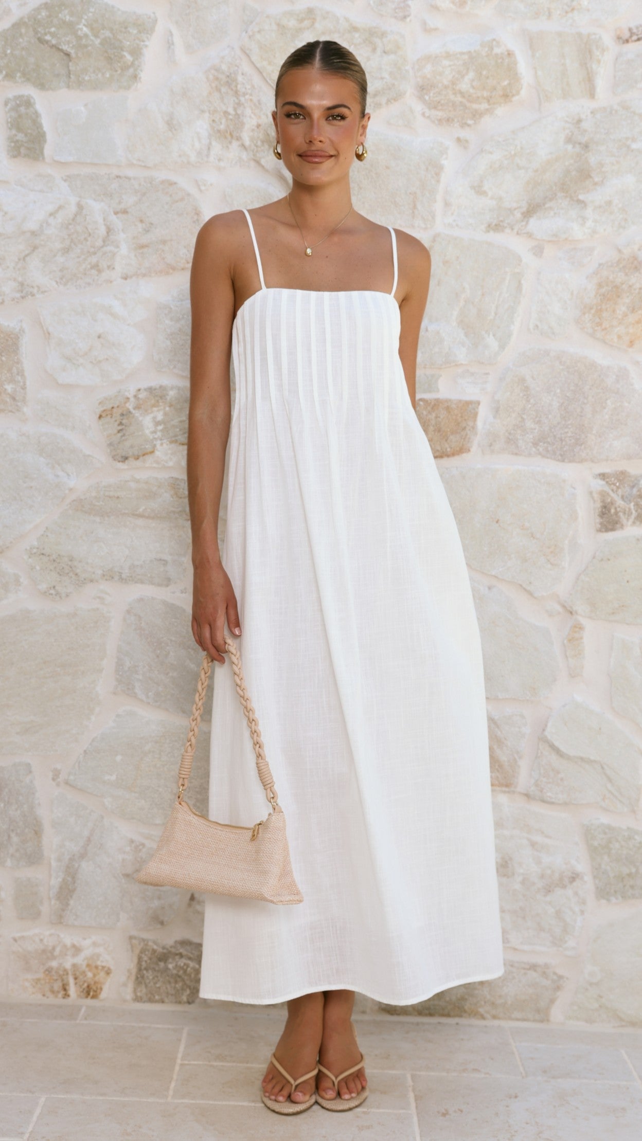 The Stayla Maxi Dress combines elegance with practical design. This maxi-length dress features a refined straight neckline and adjustable spaghetti straps for a customisable fit. The pleated bust adds subtle dimension, while the shirred back panel ensures comfort and movement. Silicone grip along the bustline keeps everything secure throughout the day. Fully lined for a polished finish.