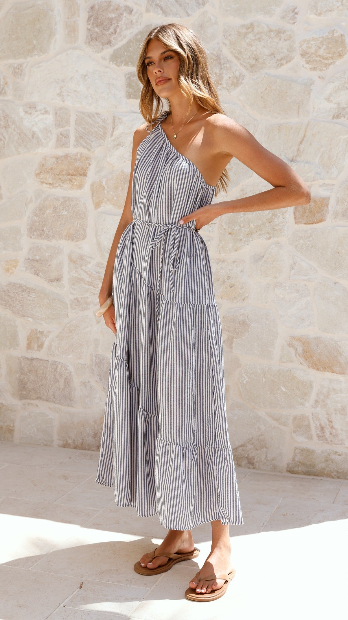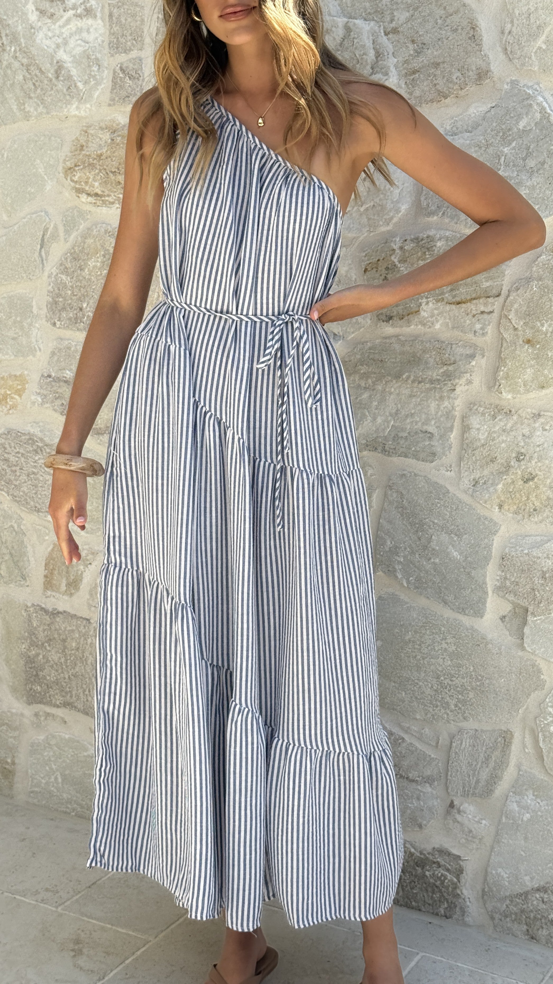 Elevate your wardrobe with the Wendy One Shoulder Maxi Dress in Blue and White Stripe. Featuring a graceful one-shoulder tie design and elegant tiered detailing, this maxi dress combines sophistication with comfort. The detachable waist tie allows for a customizable fit, while side pockets add practical charm. Perfect for making a refined statement at any event, this dress effortlessly balances style and functionality.