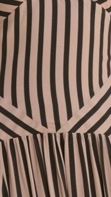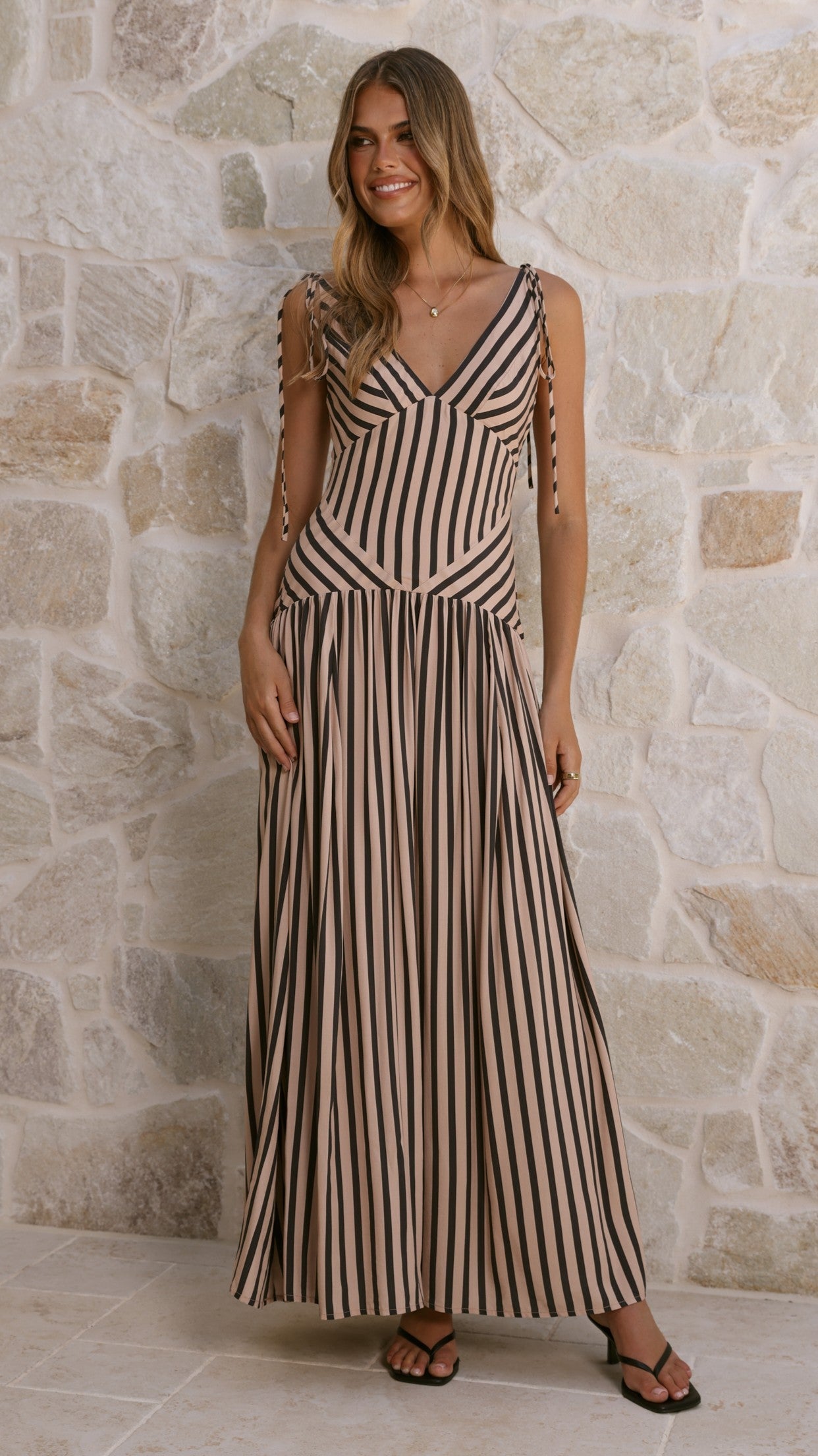 The Zoriah Maxi Dress in black and beige stripe embodies elegant simplicity. A V-neckline with triangle bust cups and tie spaghetti straps creates a flattering silhouette, while a longline bodice provides structure and definition. Full lining ensures comfort, and an invisible center back zipper maintains a seamless, polished appearance.